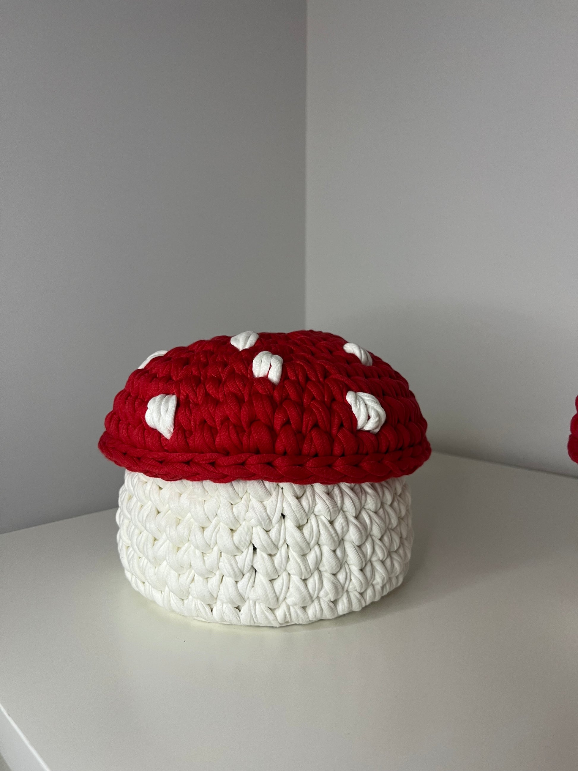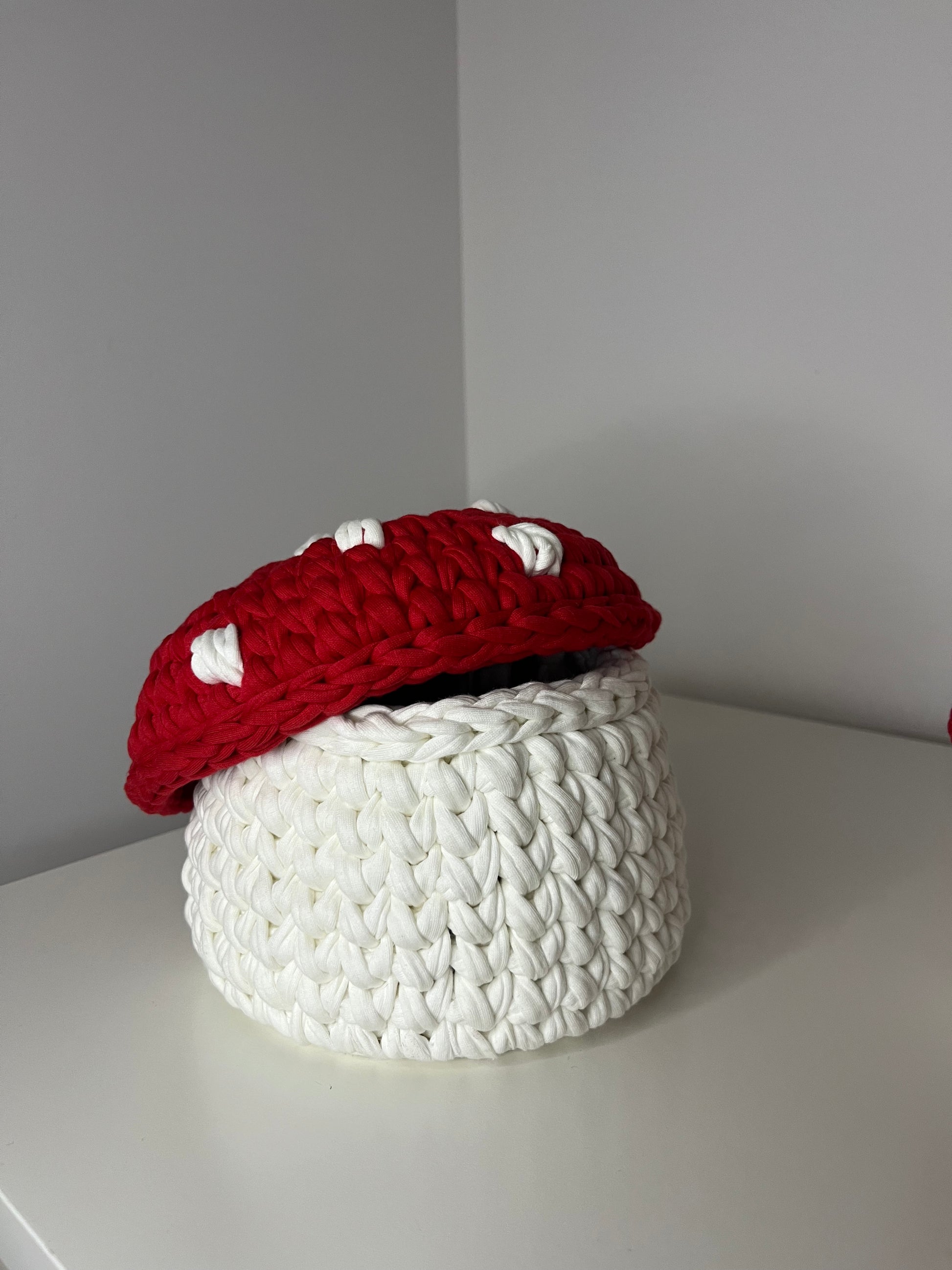 Ręcznie robiony koszyczek w kształcie muchomorka to nie tylko urocza dekoracja, ale też praktyczny schowek na drobiazgi. Sprawdzi się w salonie, sypialni czy dziecięcym pokoju – wszędzie wprowadzi odrobinę bajkowego klimatu.