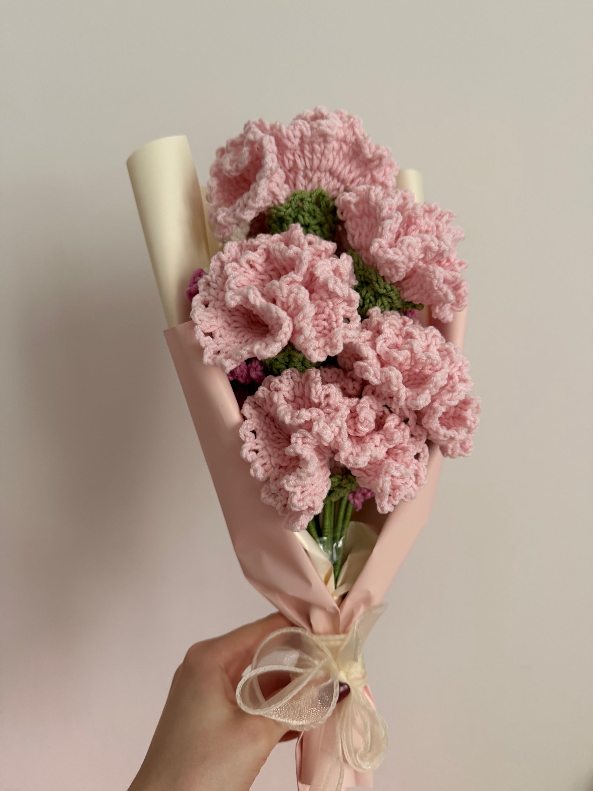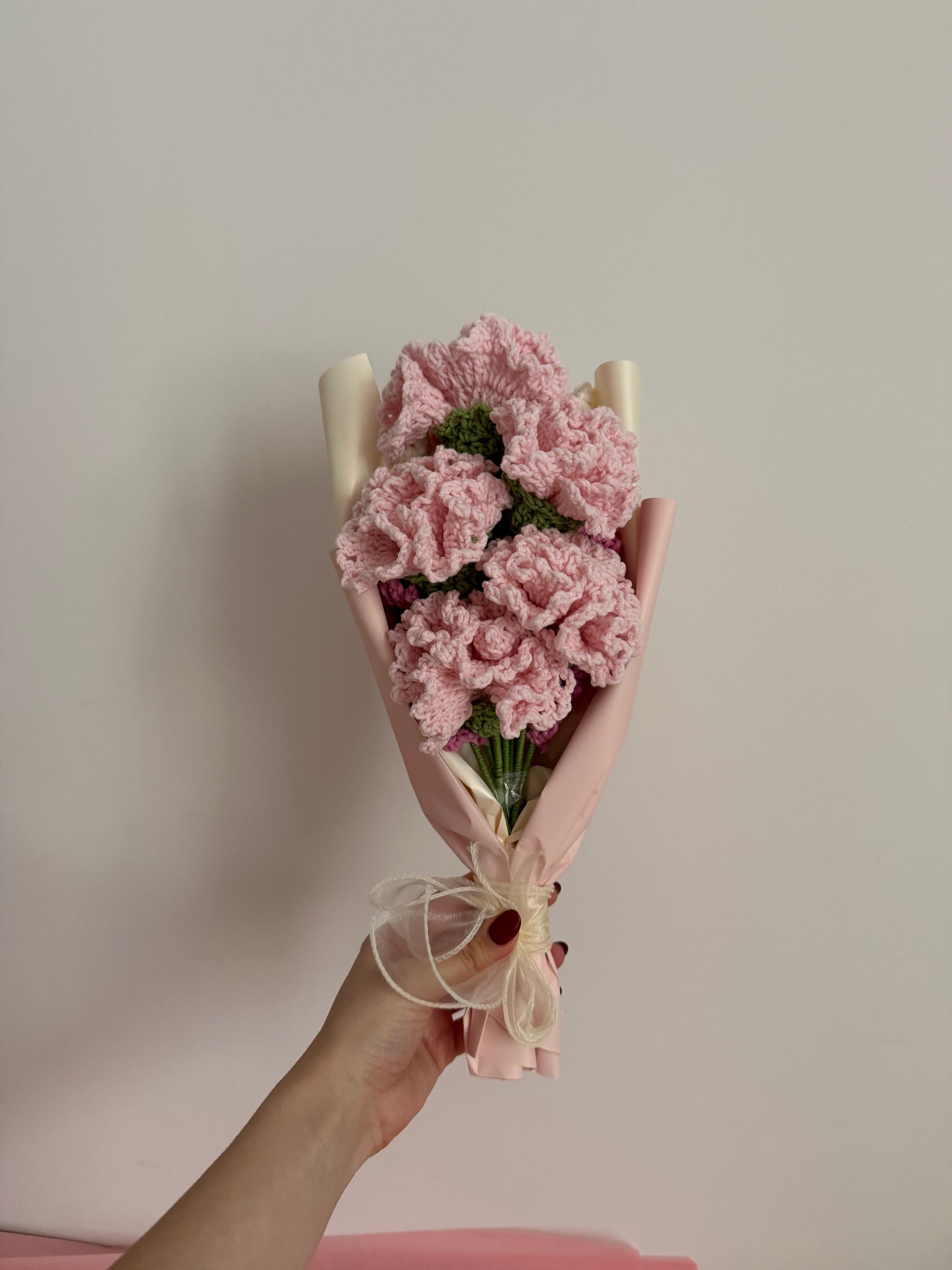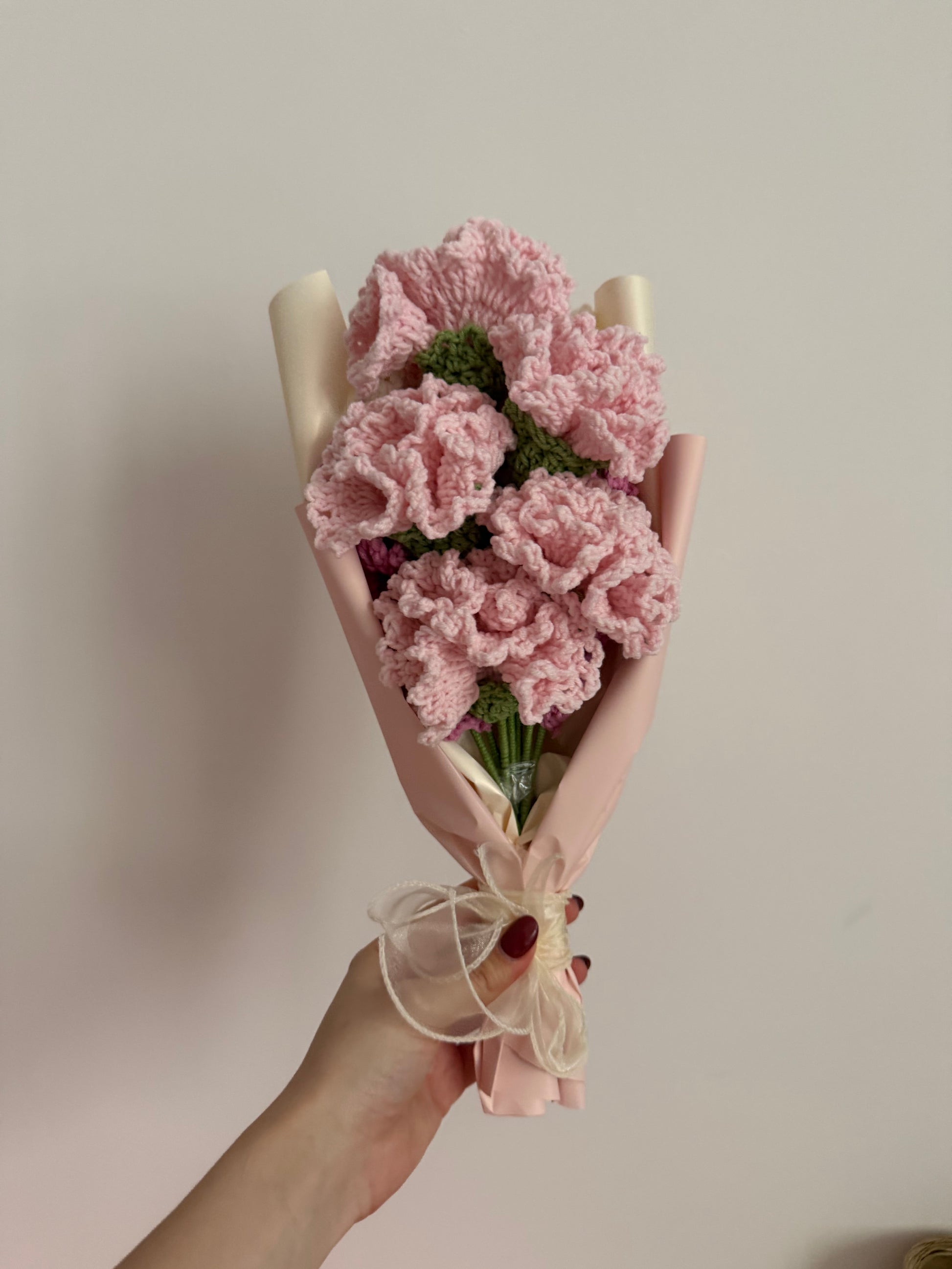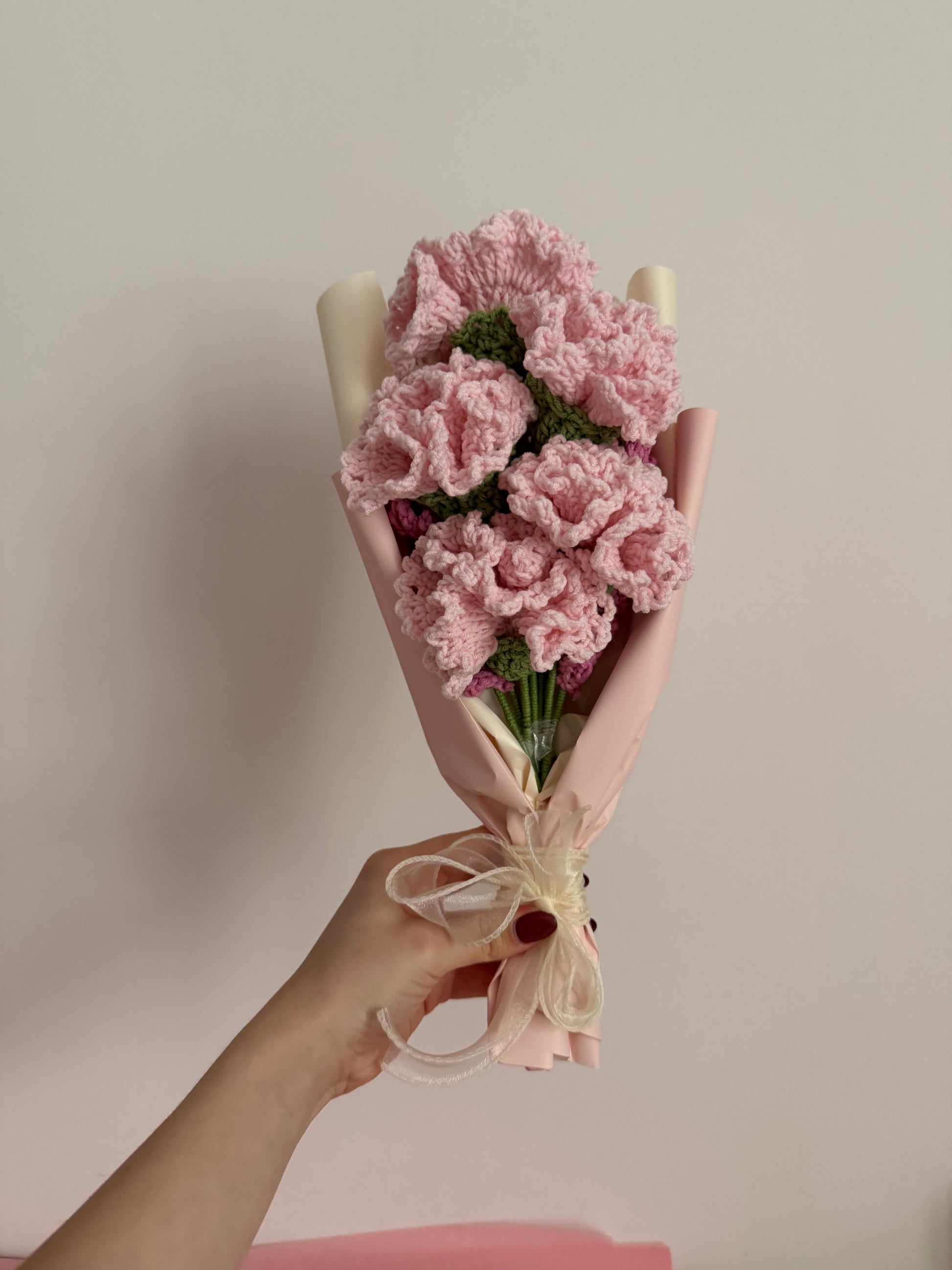 Ręcznie robiony bukiet z szydełkowymi goździkami w odcieniach różu i kremowymi gałązkami wrzosów. To wyjątkowa dekoracja, która nigdy nie zwiędnie i będzie cieszyć oko przez długie lata.