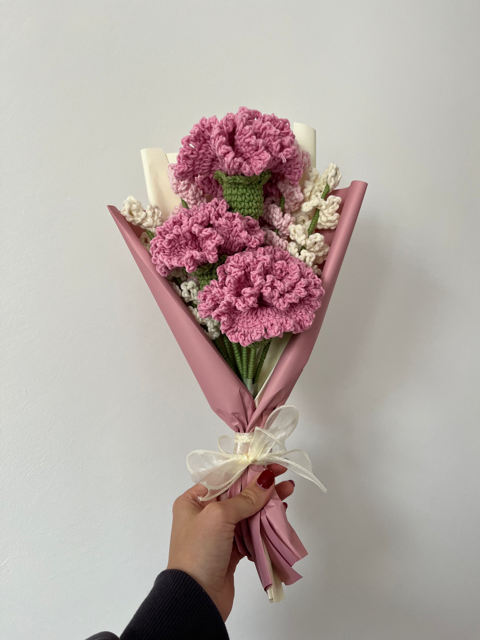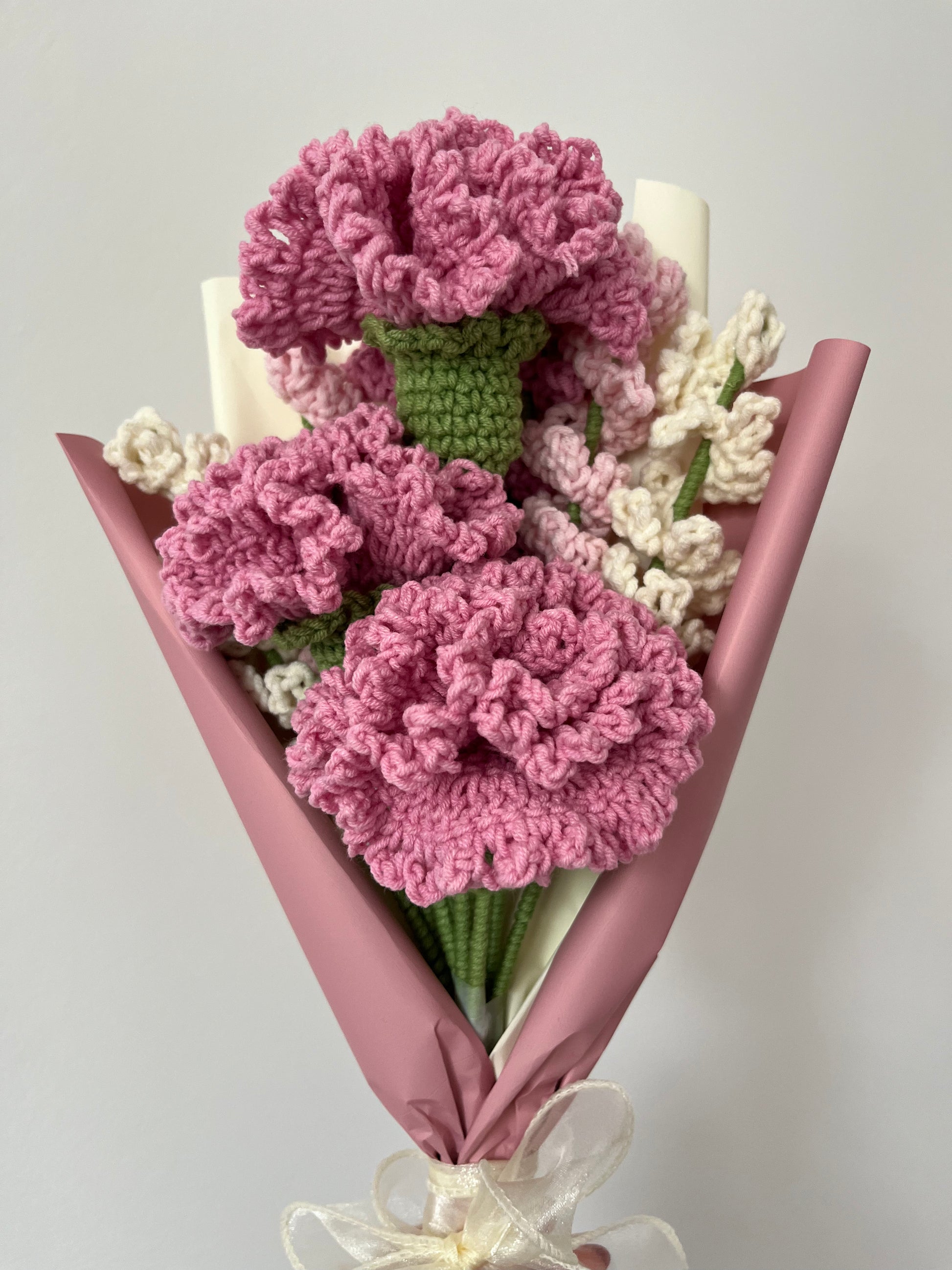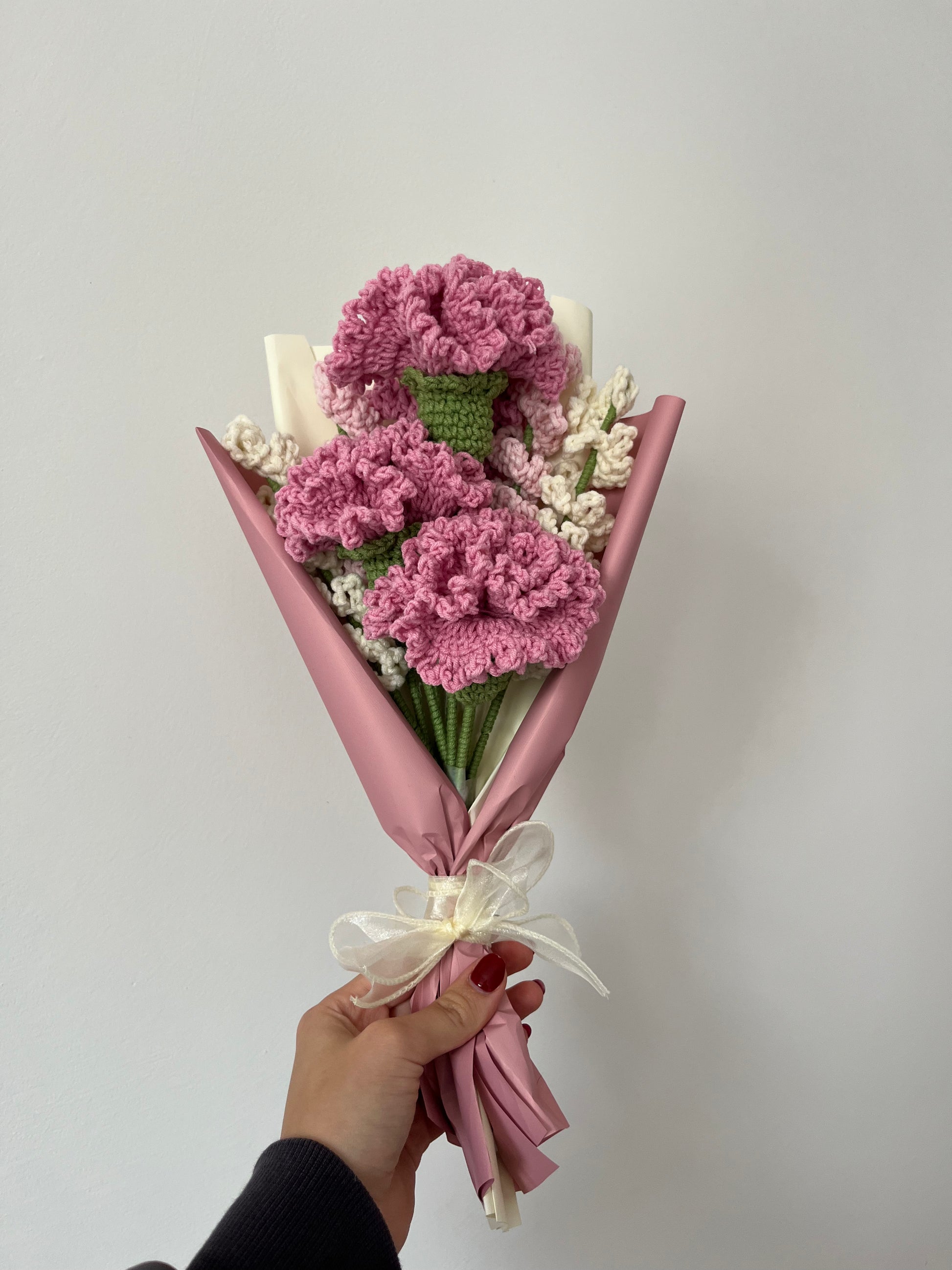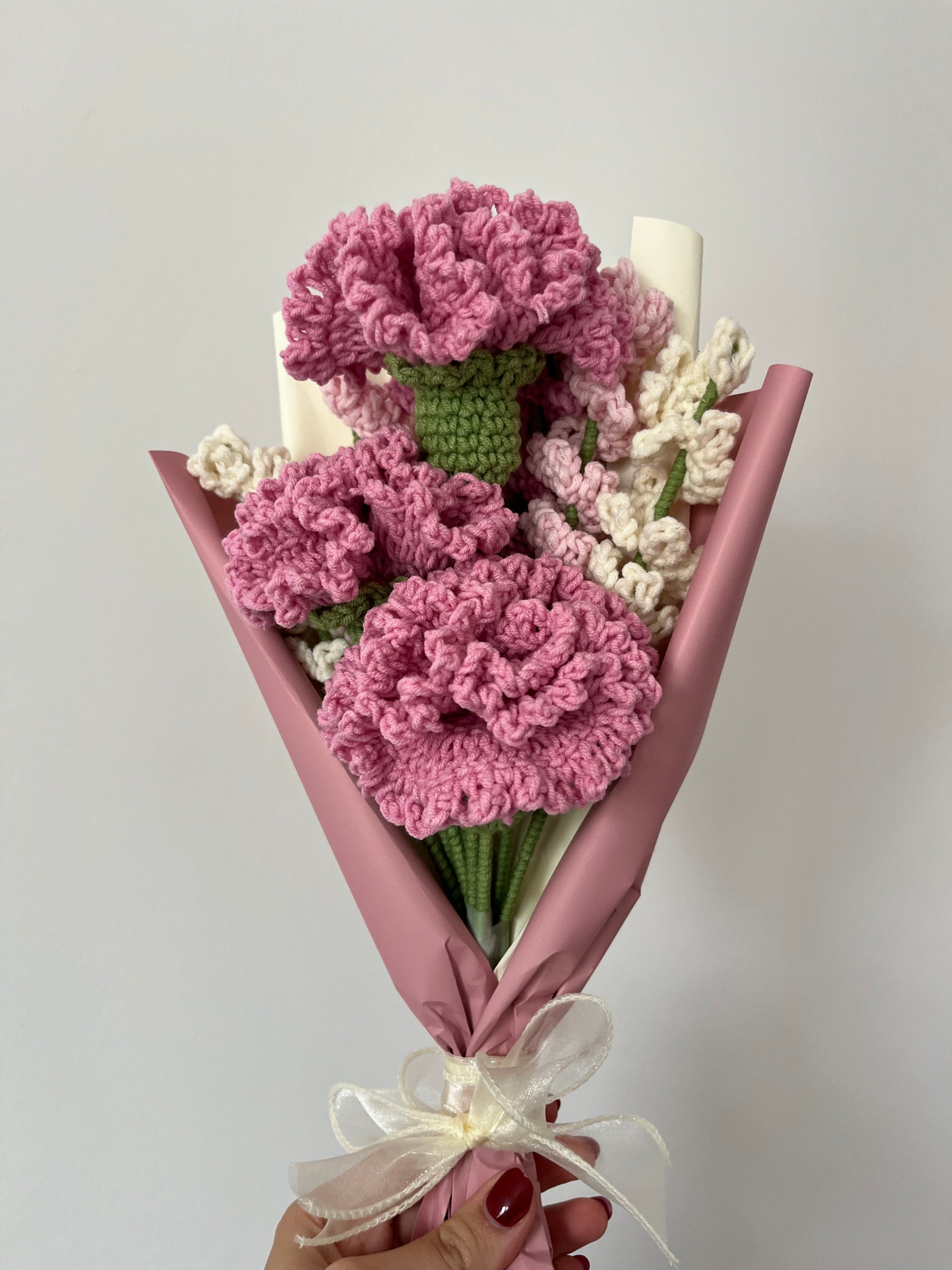 Ręcznie robiony bukiet z szydełkowymi goździkami w odcieniach różu i kremowymi gałązkami wrzosów. To wyjątkowa dekoracja, która nigdy nie zwiędnie i będzie cieszyć oko przez długie lata.