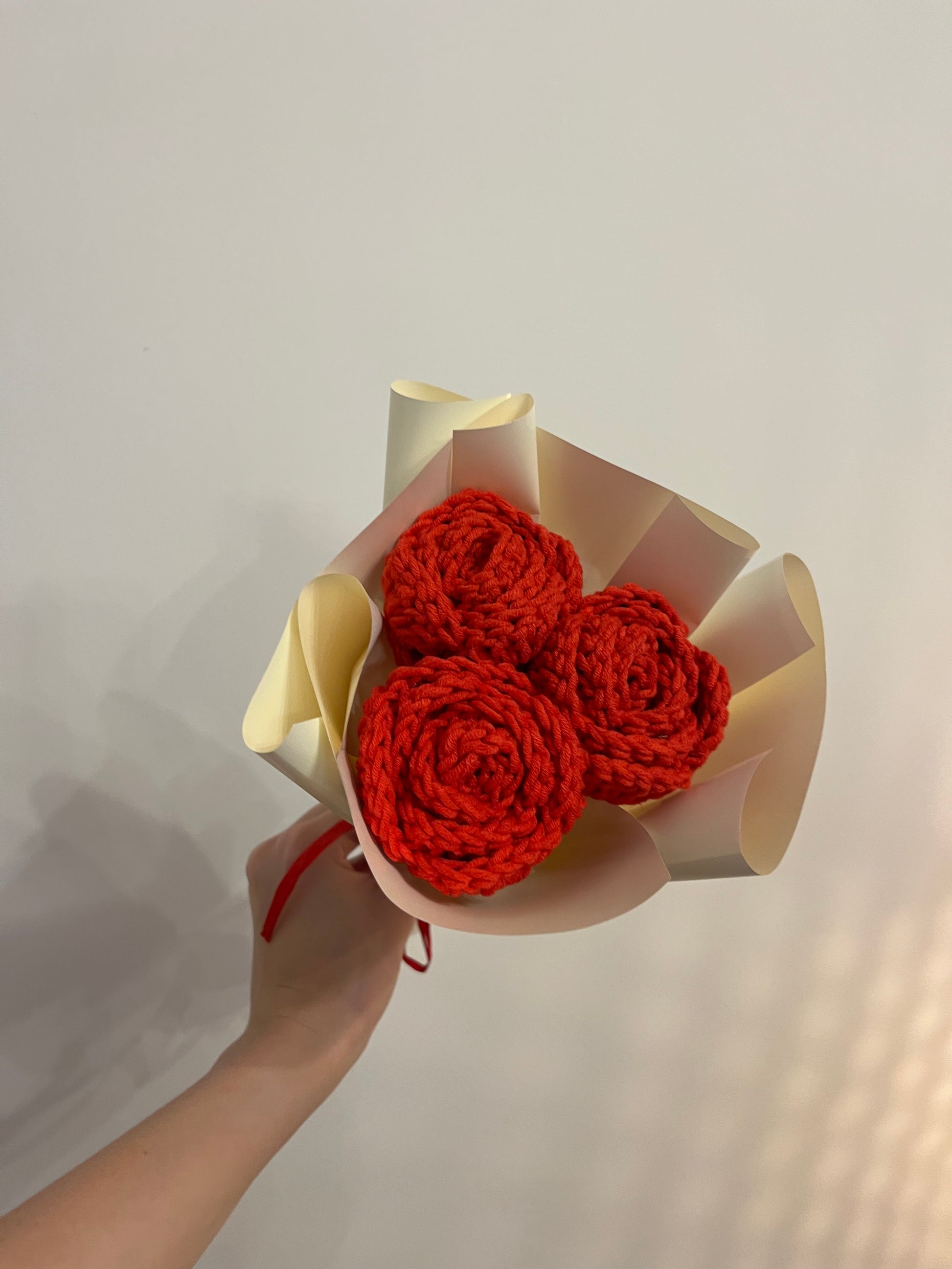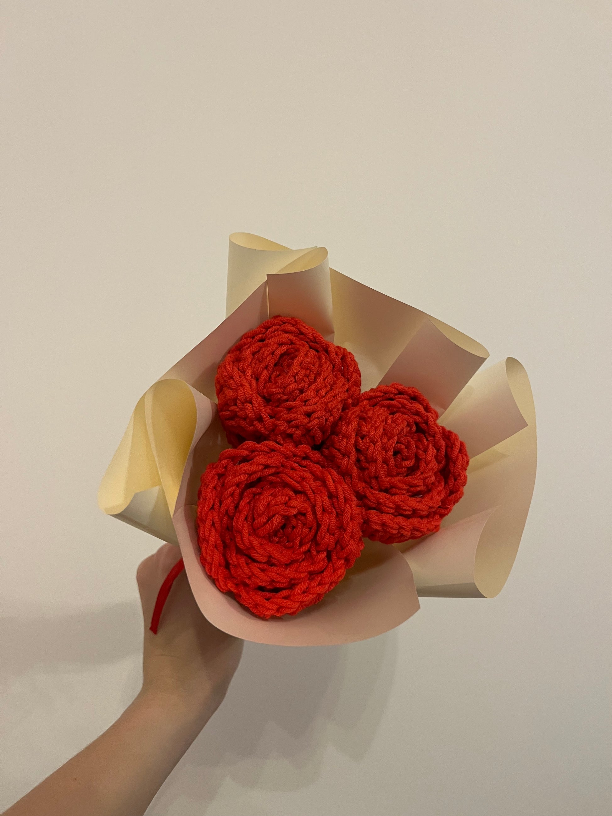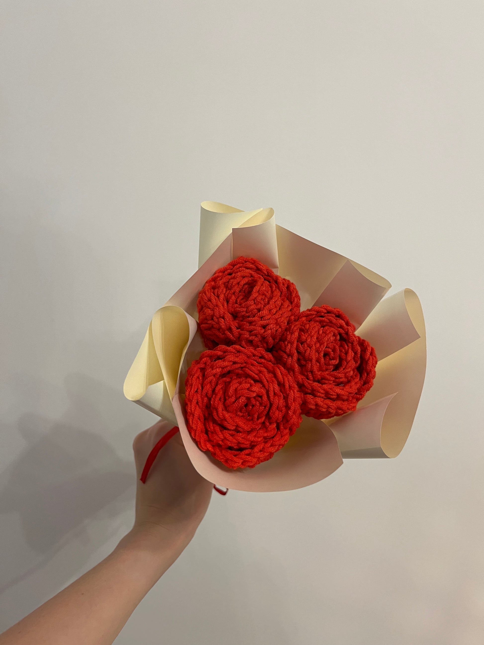 Każdy kwiat w bukiecie został ręcznie wykonany wykonany z najwyższej jakości włóczki, co czyni go wyjątkowym i trwałym dziełem sztuki.