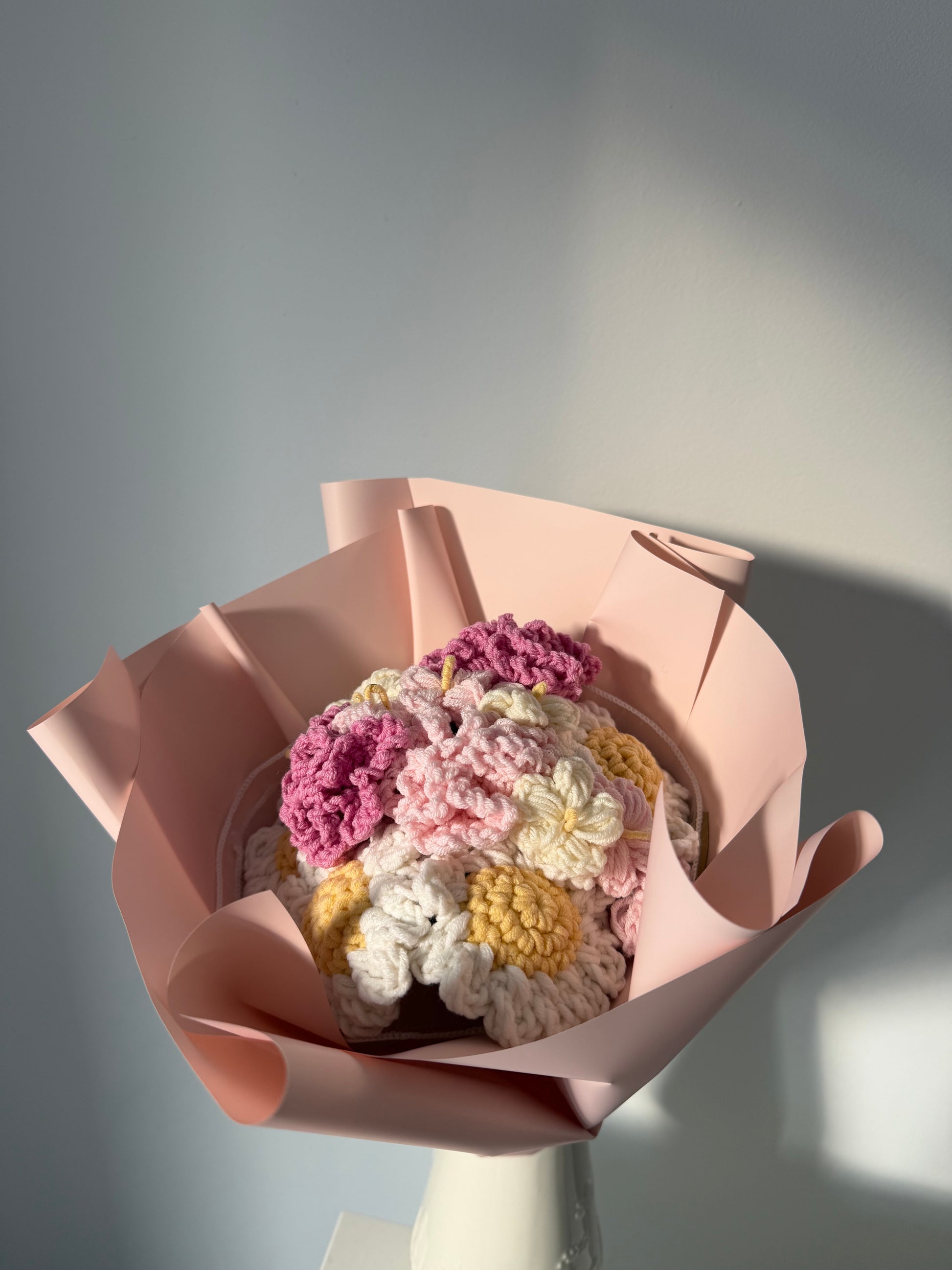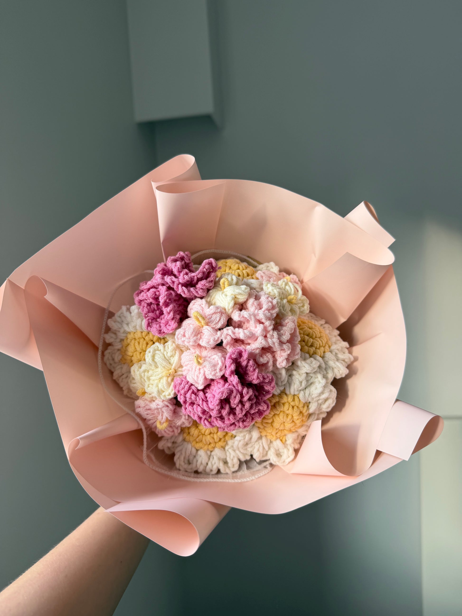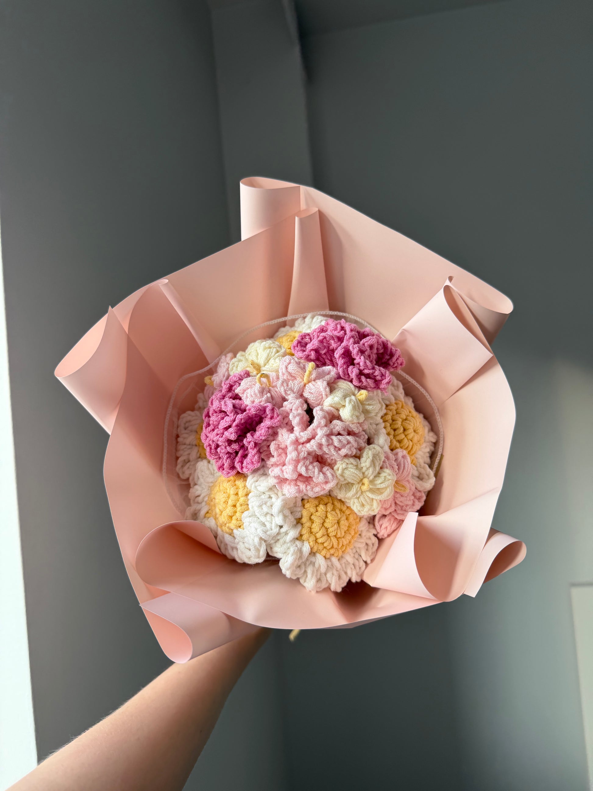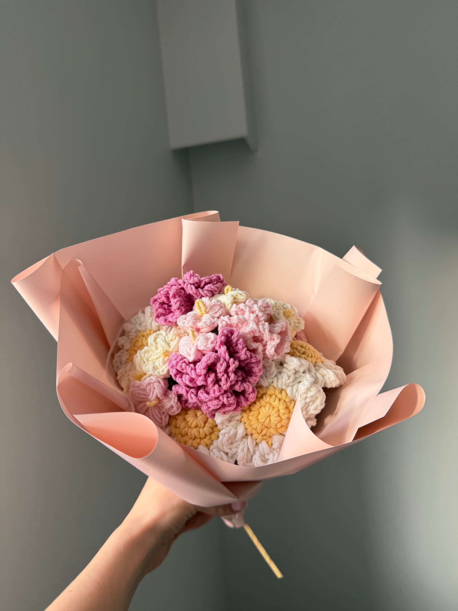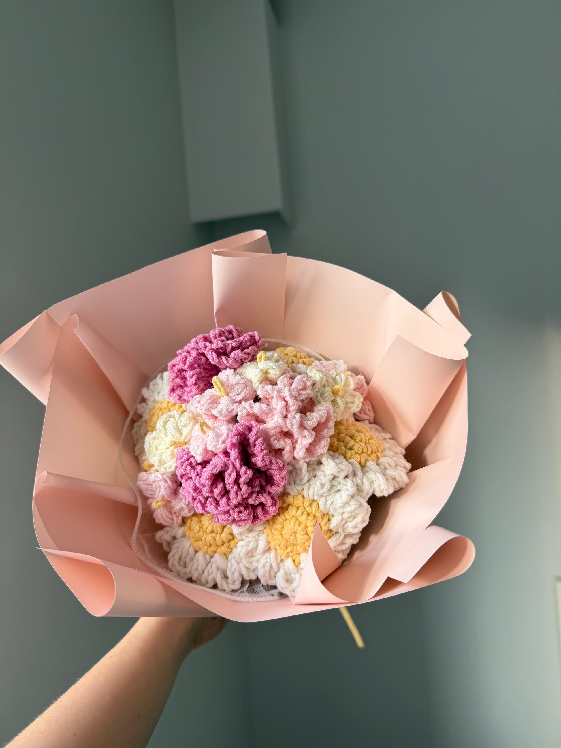 Bukiet Wiosenny to kompozycja szydełkowych goździków, niezapominajek i stokrotek połączenie delikatnych pasteli z ciepłymi, wiosennymi akcentami.