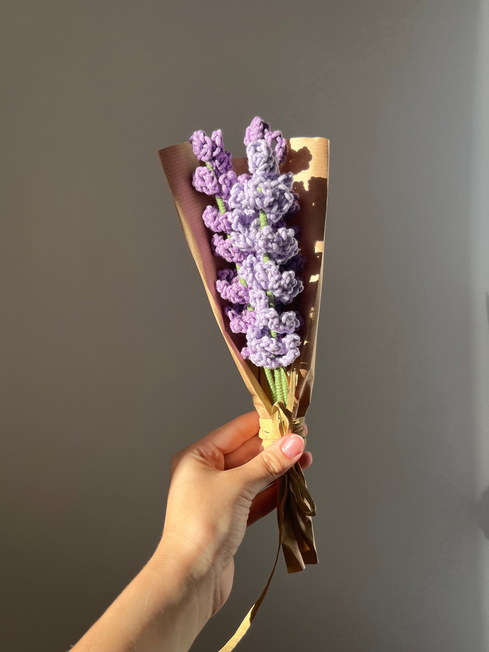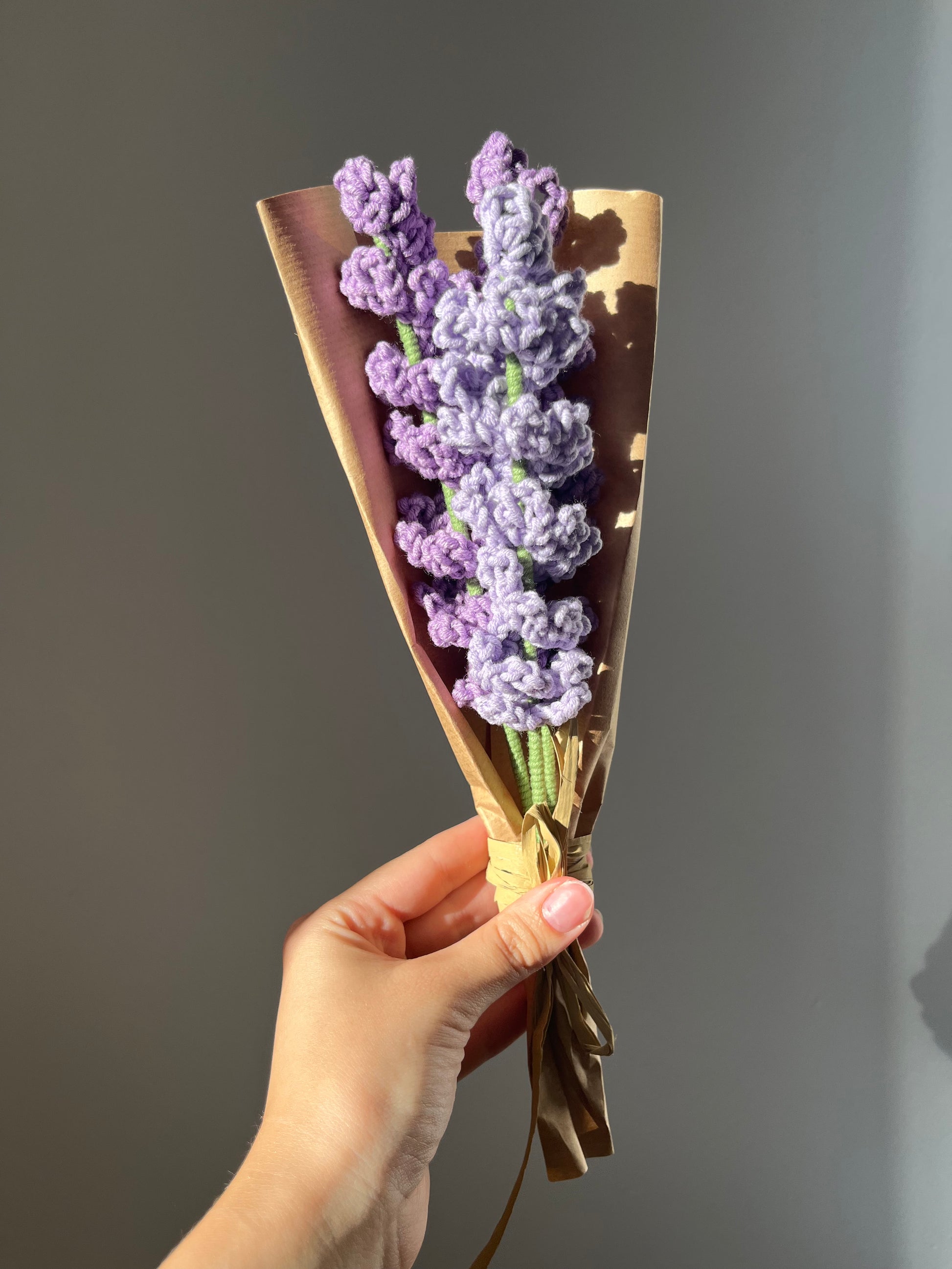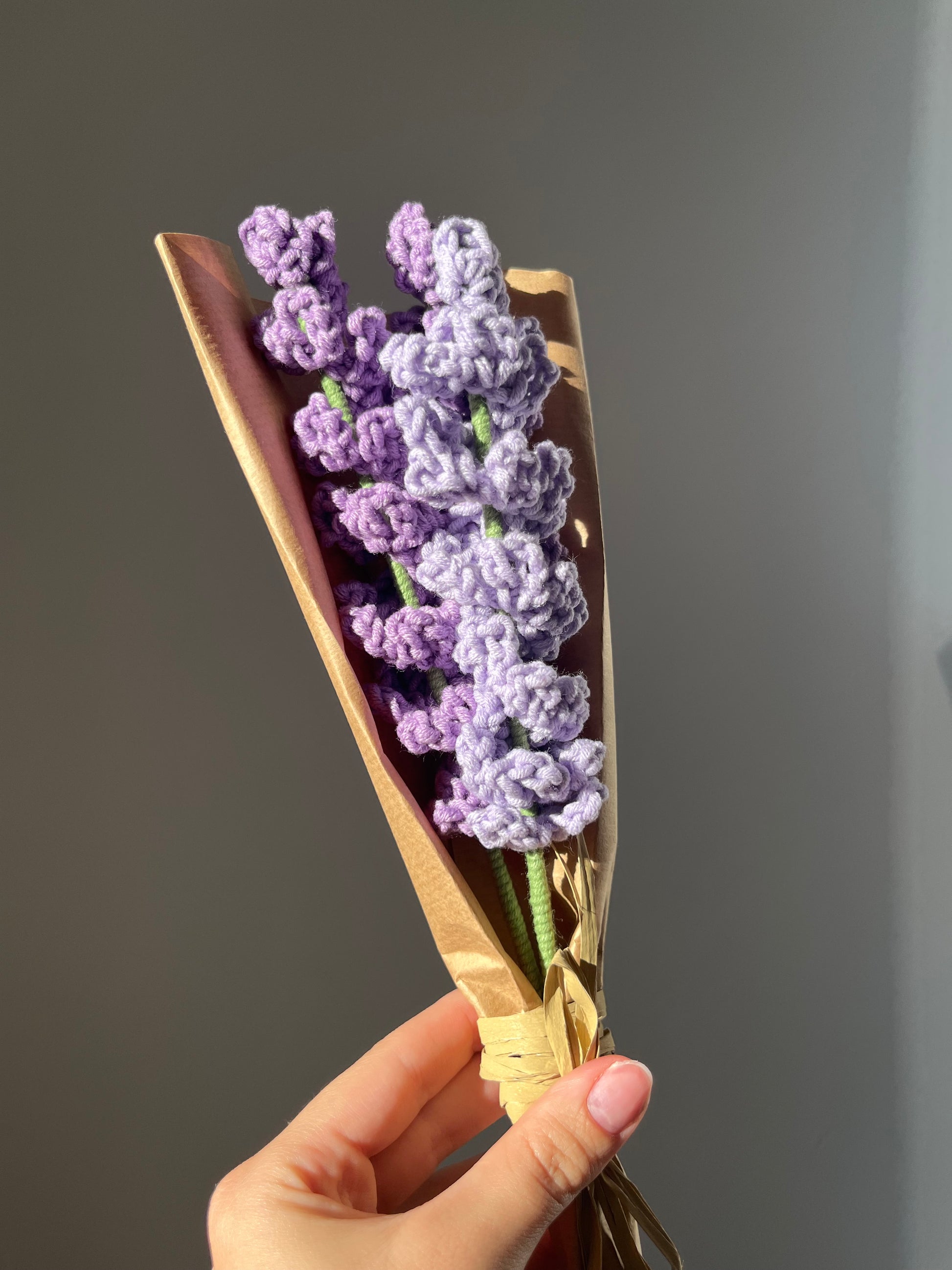 Trzy ręcznie wykonane gałązki lawendy – subtelna dekoracja w formie mini bukieciku. Dzięki szydełkowemu wykończeniu zachowuje swój urok na długo, wprowadzając do wnętrza nutę delikatności i spokoju.